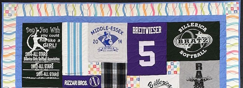 This quilt was a high school graduation quilt. It included T-shirts and other clothing that was important to this young woman.